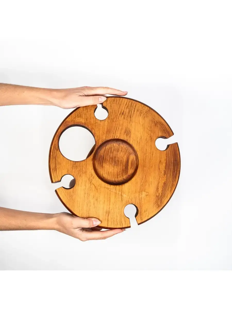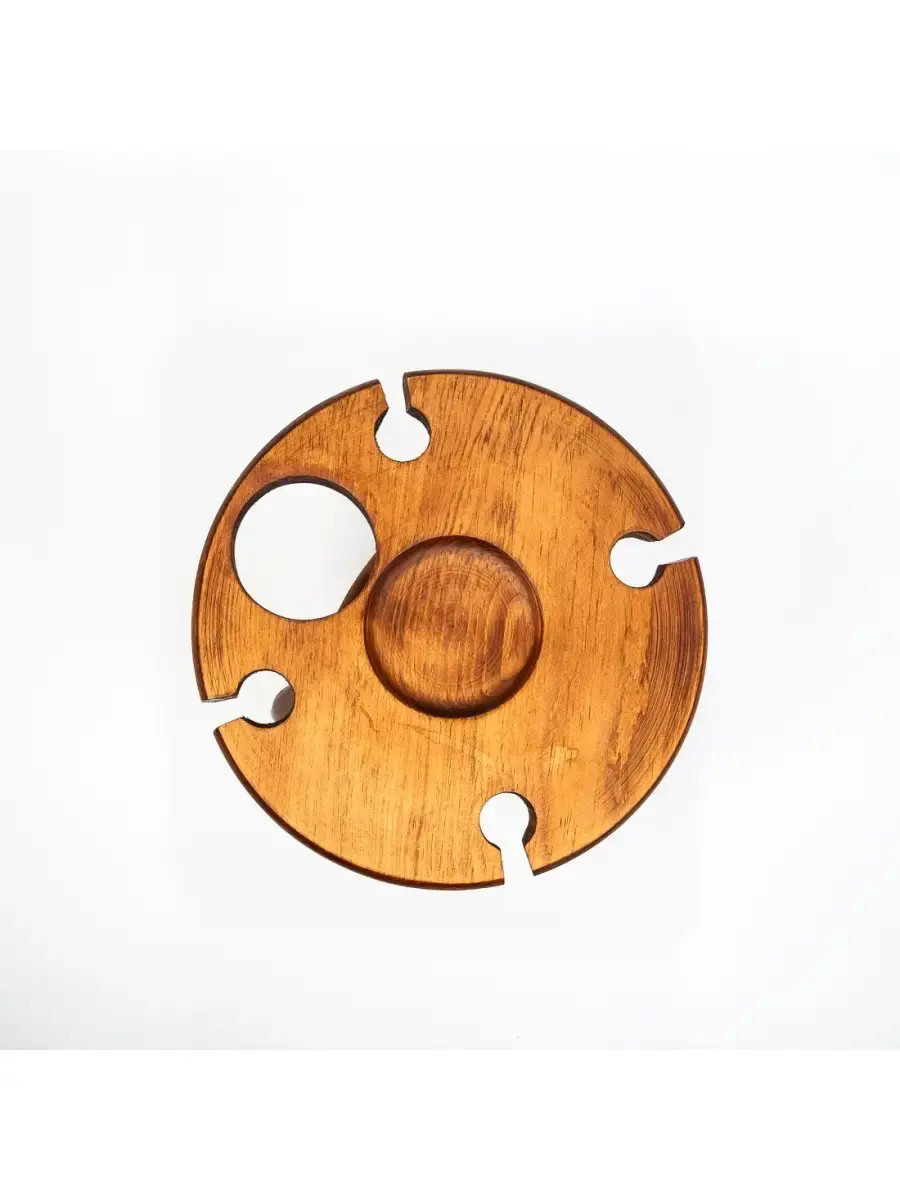 Винный столик из дерева сибирского кедра. Мобильный, легкий и компактный. Уникальная конструкция фиксирует бокалы и бутылку, что позволяет использовать их, даже на неровных поверхностях. Идеален для пикников и дома. Ручная работа из цельного массива. Покрыт составом из растительного масла, пчелиного воска и смолы кедра. Приобретая такой столик, вы можете быть абсолютно уверенны в 100% уникальности и полезности изделия. Также это отличный подарок любимым и друзьям! Размер: диаметр столешницы 30 см., высота 24 см. Отверстие под любой размер бутылки.