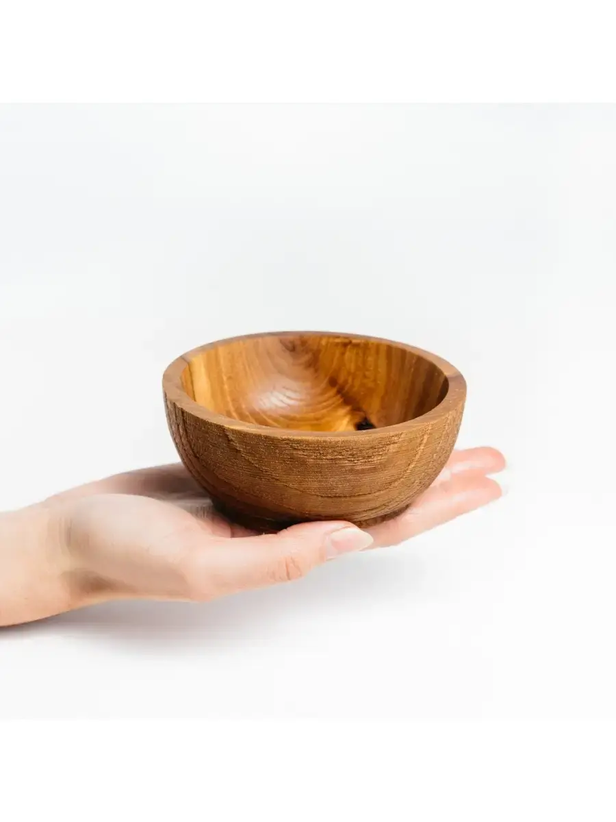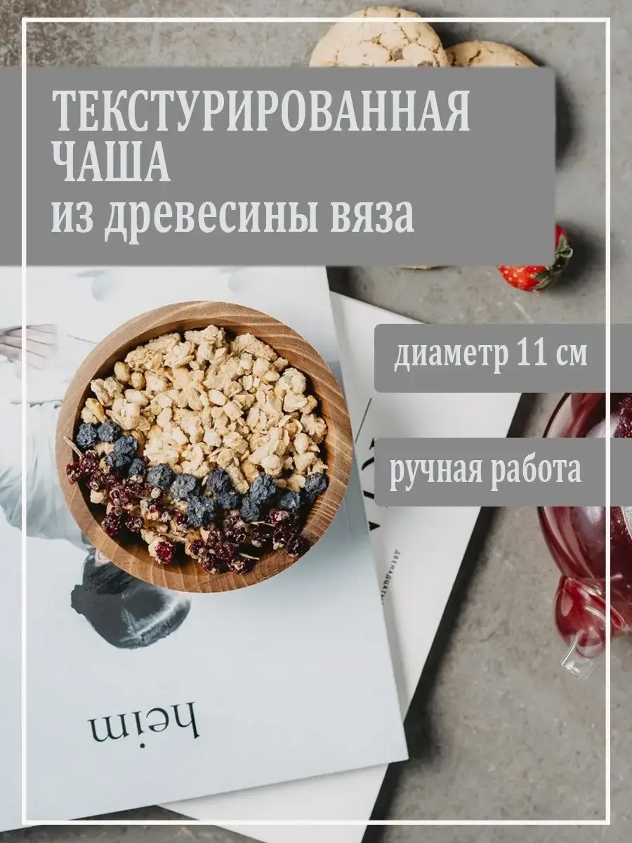 Текстурированная чаша из Сибирского Вяза (карагач). Пропитана нашим составом на основе растительного масла, кедровой смолы и пчелиного воска. Для пищи. Для бульонов и каш. Жидкого и твердого. Горячего и холодного. Прекрасно подходит для соусов или подачи орехов/сухофруктов! Сделана в ручную с любовью и удовольствием! Перед использованием обязательно промыть теплой проточной водой, чтоб смыть остатки масла и морилки. Изделие может стать чуть светлее. Первое время возможно оставление следов от морилки, поэтому лучше для протирания использовать бумажные полотенца. Размер: диаметр 11 см, высота 4,5 см, диаметр основания 8 см.