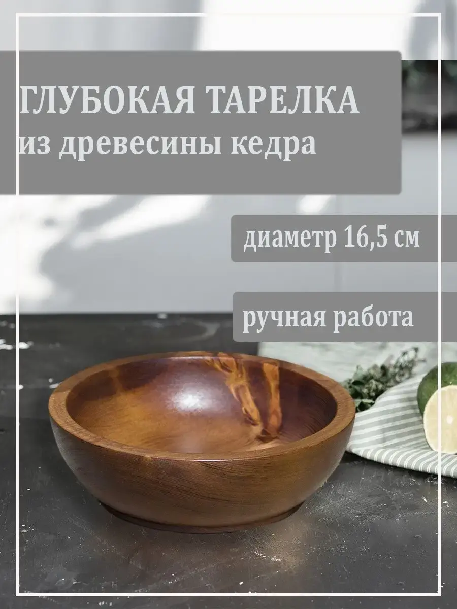 Глубокая тарелка из цельного куска дерева. Ручной работы из Сибирского Кедра! Покрыта для придания цвета водной морилкой "орех". Пропитана нашим составом на основе растительного масла, кедровой смолы и пчелиного воска. Перед использованием обязательно промыть теплой проточной водой, чтоб смыть остатки масла и морилки. Изделие может стать чуть светлее. Первое время возможно оставление следов от морилки, поэтому лучше для протирания использовать бумажные полотенца. Популярность посуды из кедра объясняется как красотой древесины, так и ее лечебными качествами. Тарелки и миски удобны для приема пищи и для ее хранения. Люди, пользующиеся такими тарелками, могут подтвердить, что еда сохраняет свежесть намного дольше: она не прокиснет и не покроется плесенью. Древесина кедра придаст пище особый аромат и вкус. Размер: Диаметр 165 мм. Высота 47 мм.