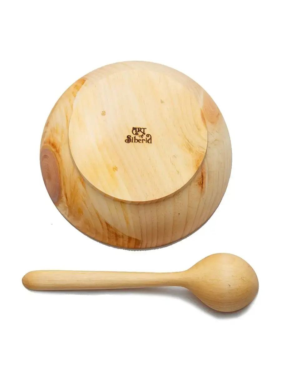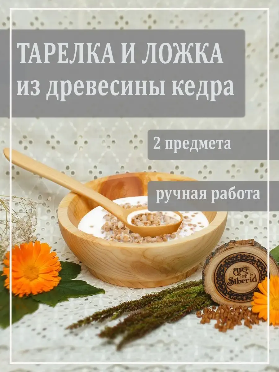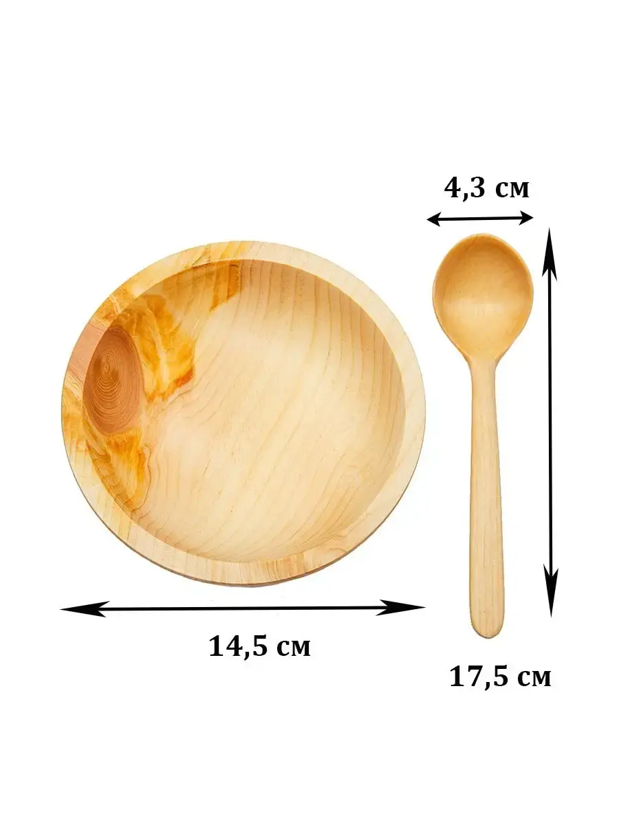 Тарелка и ложка из натурального дерева сибирского кедра! Наша посуда из кедра имеет красивую текстуру, приятный оттенок, выделяет тонкий аромат, дезинфицирующий воздух помещений. Она обладает бактерицидными, антимикробными свойствами, аромат кедра способен оздоравливать воздух, придавать ему целебные качества. Велико санитарно-гигиеническое и лечебно-профилактическое действие кедровой посуды. Пригодна для пищевых продуктов. Для горячего и для жидкого. Абсолютно экологичный продукт. Перед использованием обязательно промыть теплой проточной водой, чтоб смыть остатки масла и морилки. Изделие может стать чуть светлее. Первое время возможно оставление следов от морилки, поэтому лучше для протирания использовать бумажные полотенца. **Размер: т**арелка диаметр 14,5 см., высота 4,7 см - 1 шт.; ложка длинна 17,5 см., диаметр 4,3 см - 1шт.