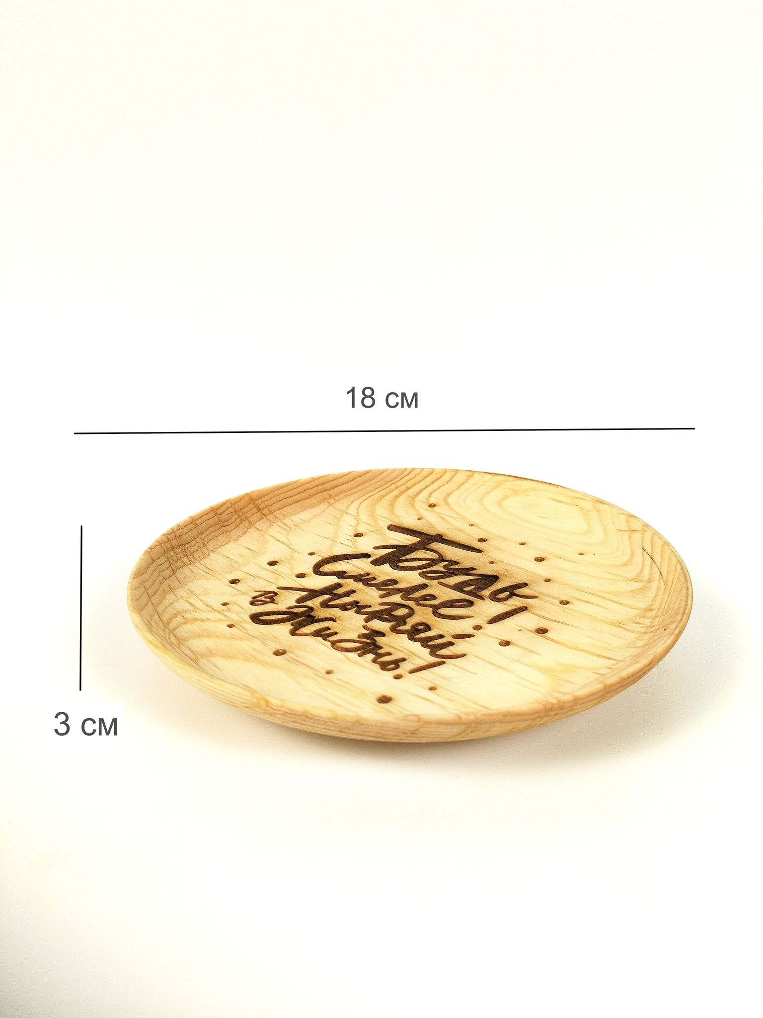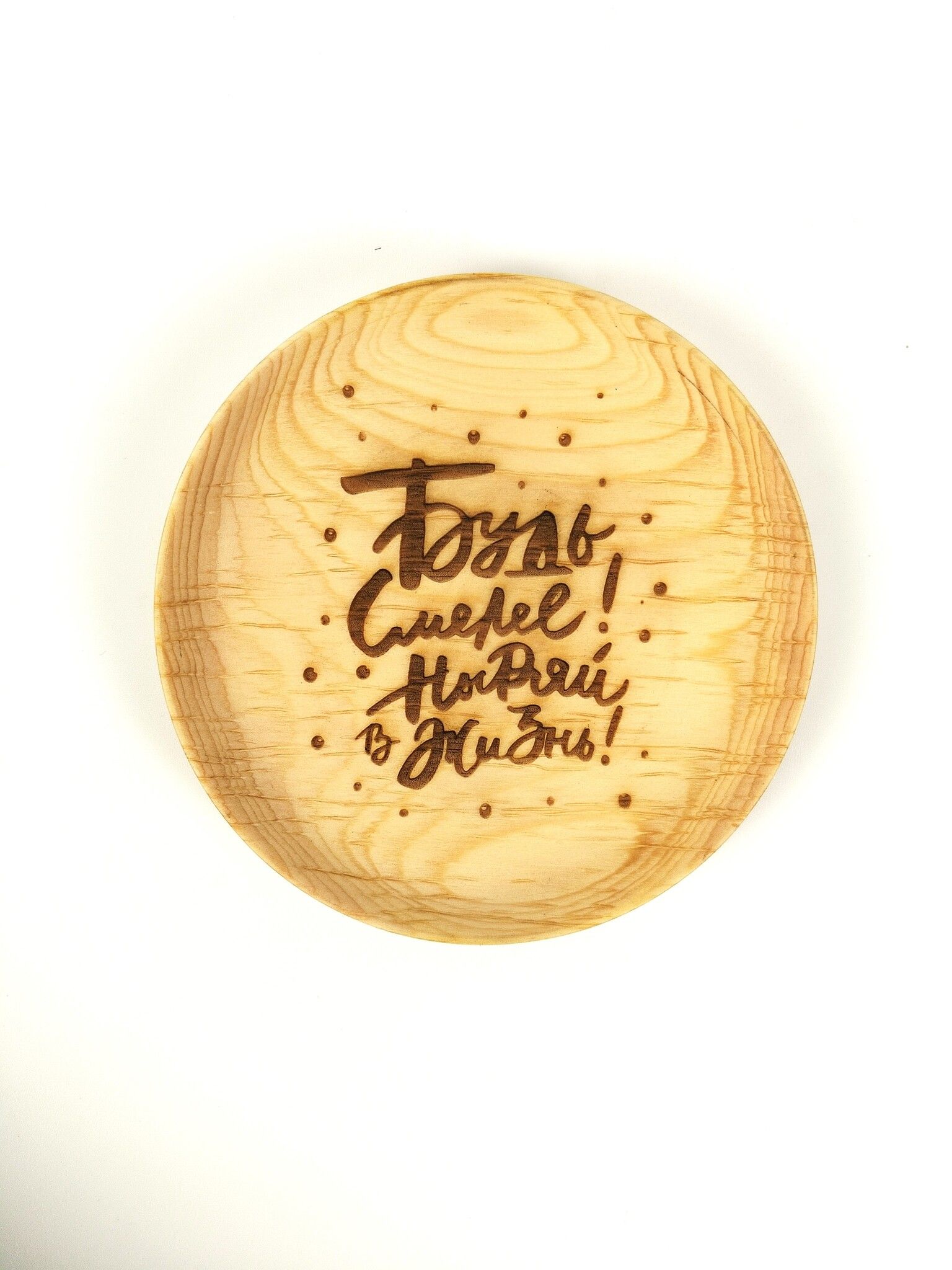 Тарелка из сибирского кедра с мотивационной надписью.