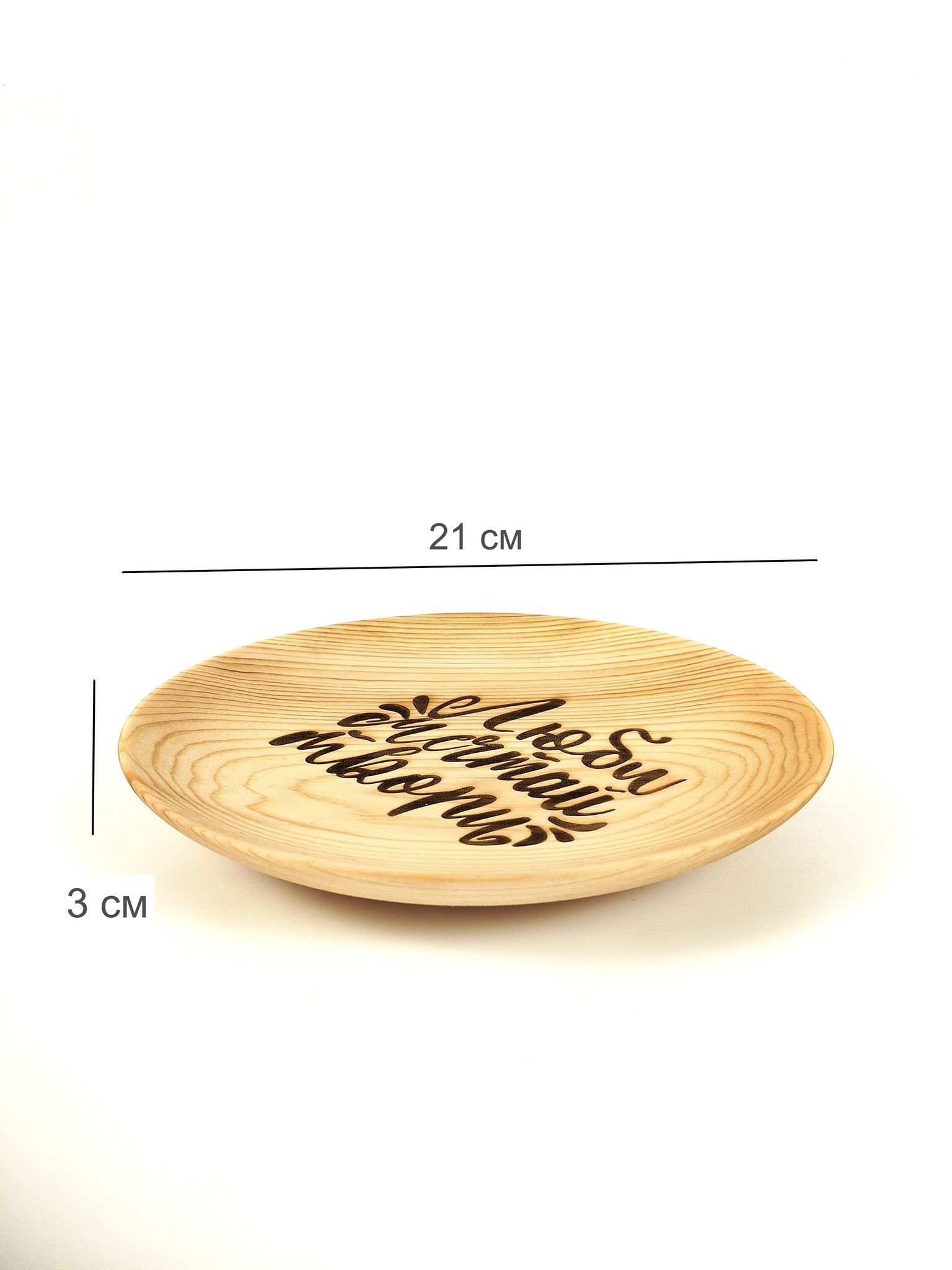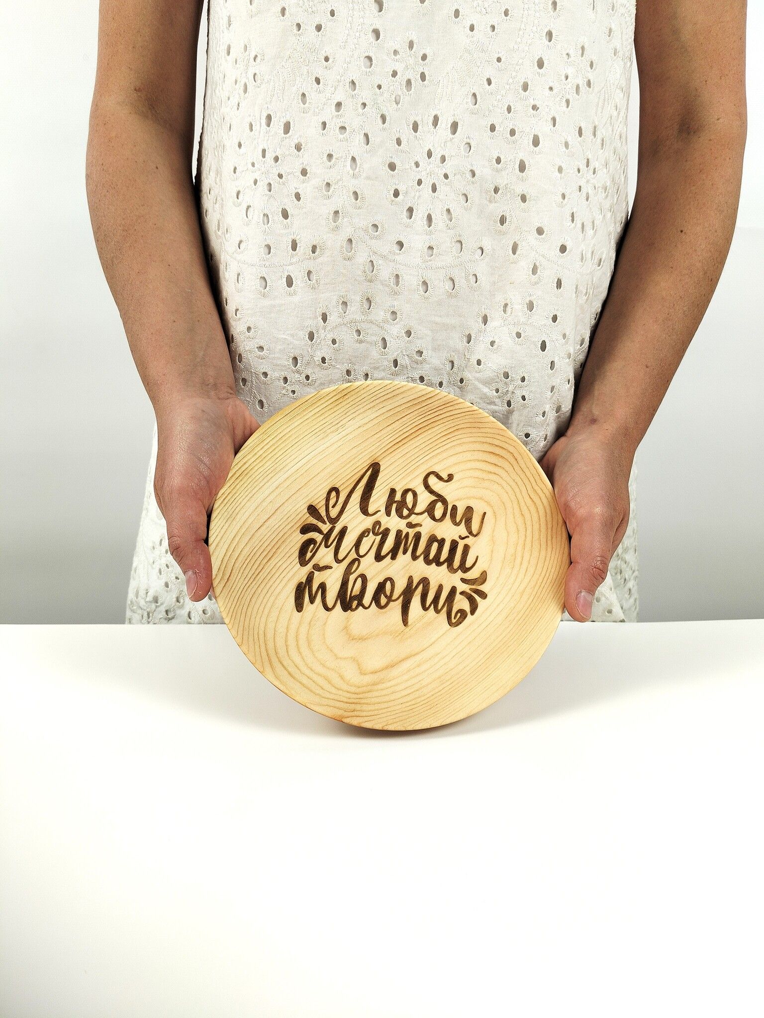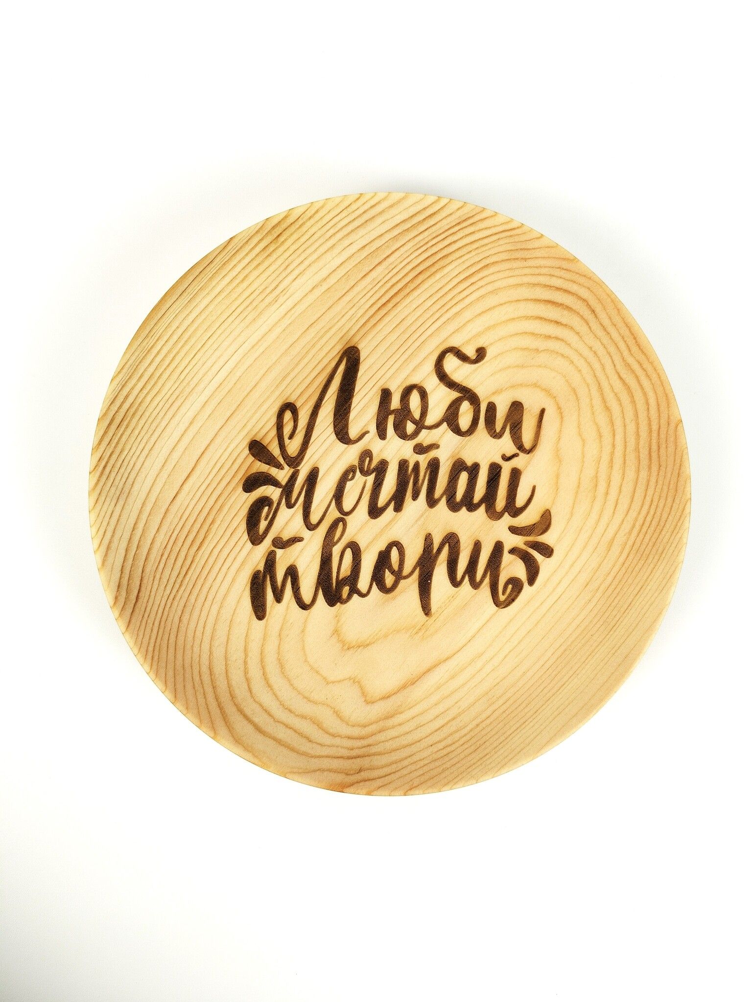 Фраза «Люби, мечтай, твори», выполнена лазерной гравировкой, делает эту тарелку не просто посудой, а личным посланием.