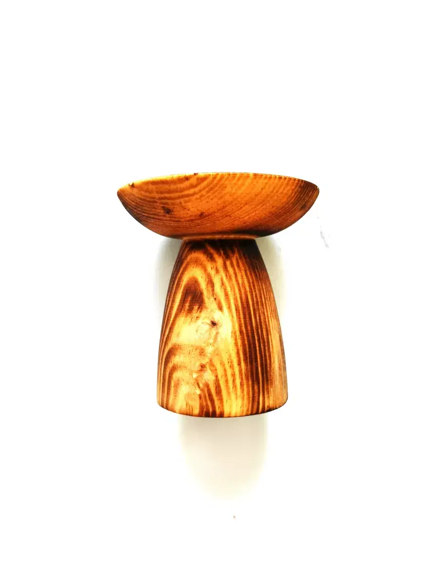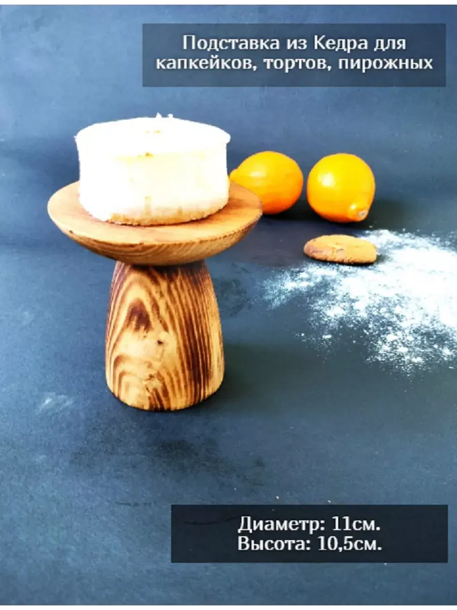 Подставка для капкейков и пирожных из СИБИРСКОГО КЕДРА в цвете "обжиг"! Подставка для капкейков, тортов и конфет из сибирского кедра придаст тепла и уюта любому застолью - праздничному или повседневному. Сервировка стола должна гармонировать с интерьером, поэтому деревянная тортовница смотрится легко и интересно на любой кухне. Снаружи покрыта лаком, зона для торта пропитана составом из растительного масла, кедровой смолы и пчелиного воска. Подходит как для горячего, так и для холодного. Размер: диаметр подставки 108 мм., диаметр основания 68 мм. Высота 105 мм.