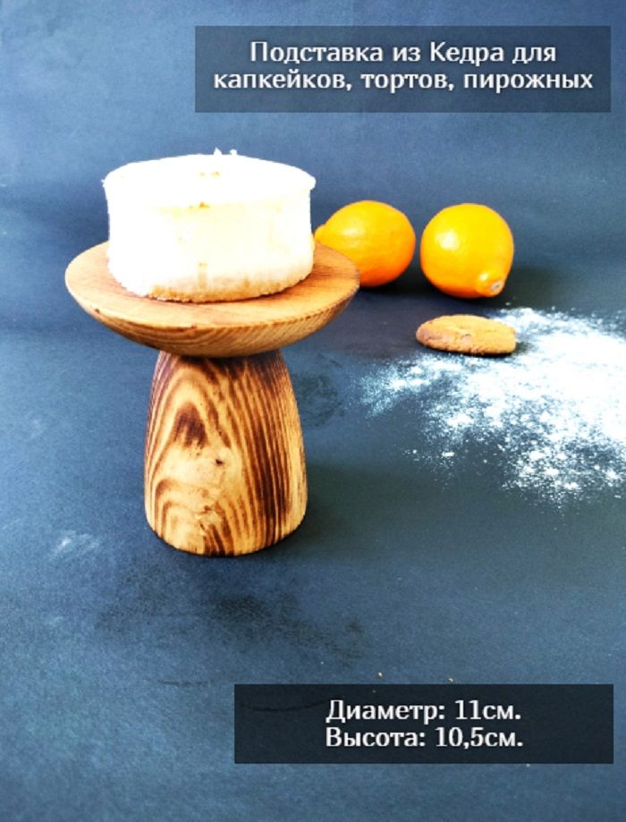 Подставка для капкейков и пирожных из СИБИРСКОГО КЕДРА! Подставка для капкейков, тортов и конфет из сибирского кедра придаст тепла и уюта любому застолью - праздничному или повседневному. Сервировка стола должна гармонировать с интерьером, поэтому деревянная тортовница смотрится легко и интересно на любой кухне. Снаружи покрыта лаком, зона для торта пропитана составом из растительного масла, кедровой смолы и пчелиного воска. Подходит как для горячего, так и для холодного. Размер: диаметр подставки 108 мм., диаметр основания 68 мм. Высота 105 мм.