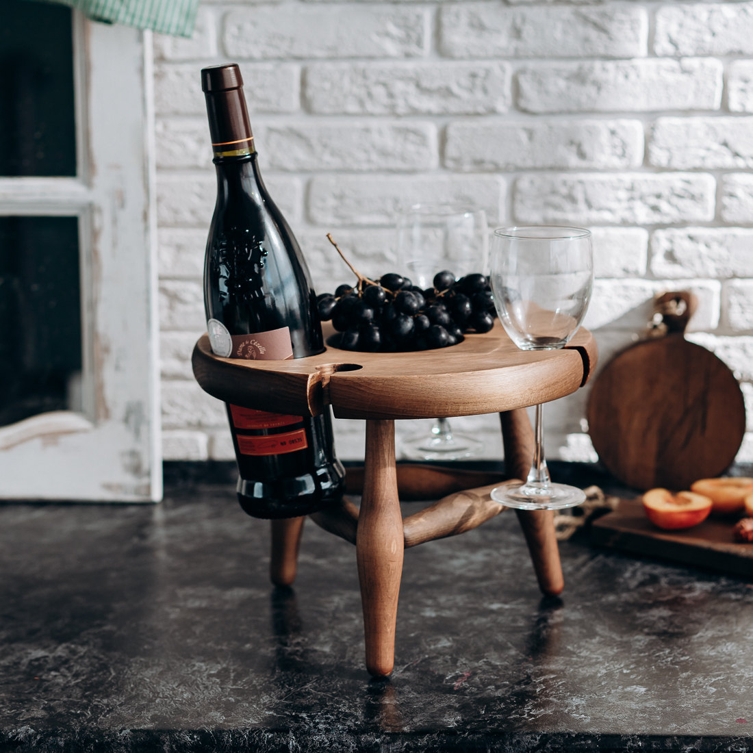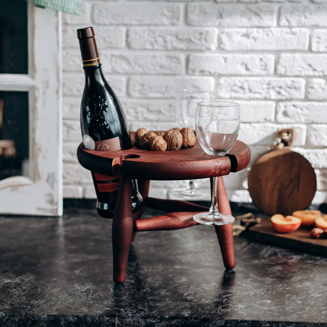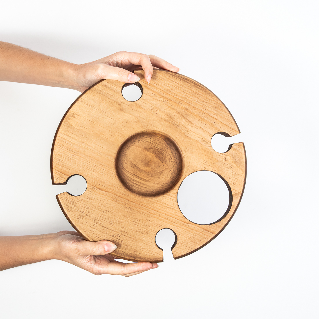 На фото – винный столик из дерева сибирского кедра. Мобильный, легкий и компактный. Уникальная конструкция фиксирует бокалы и бутылку, что позволяет использовать их, даже на неровных поверхностях. Идеален для пикников и дома. Ручная работа из цельного массива. Покрыт составом из растительного масла, пчелиного воска и смолы кедра. Возможные цвета: орех, махагон, дуб или оставить натуральный оттенок. Приобретая такой столик, вы можете быть абсолютно уверенны в 100% уникальности и полезности изделия. Также это отличный подарок любимым и друзьям!