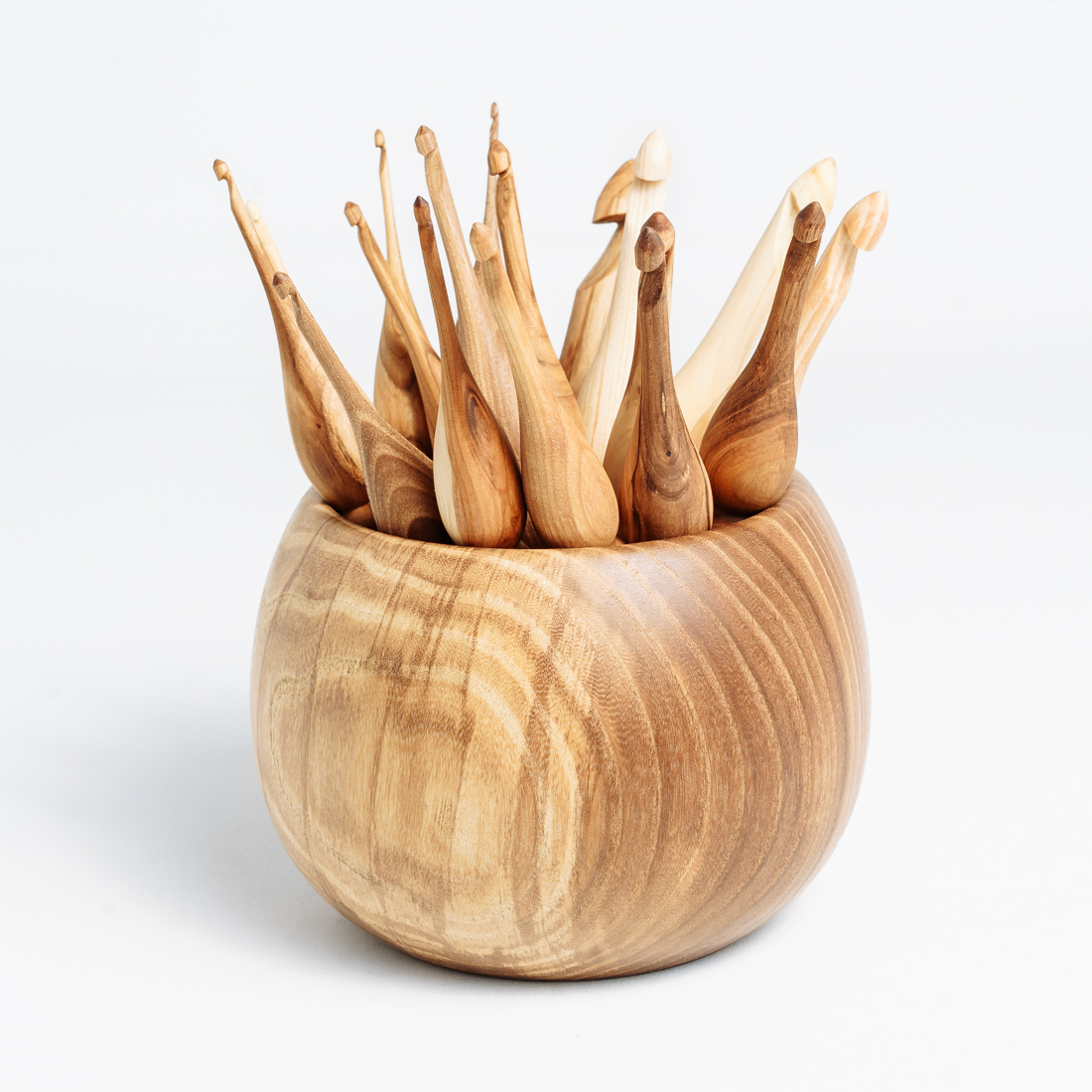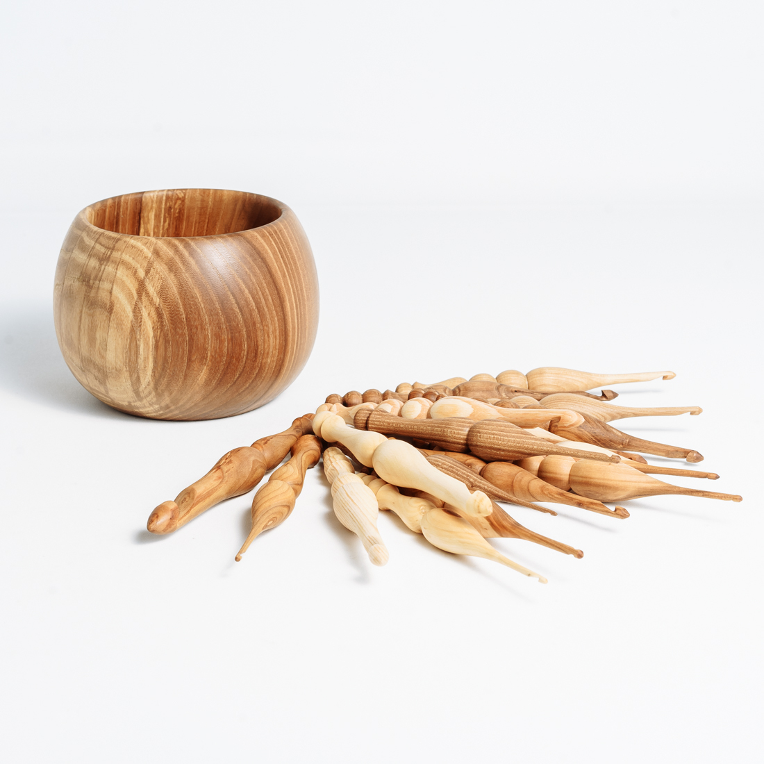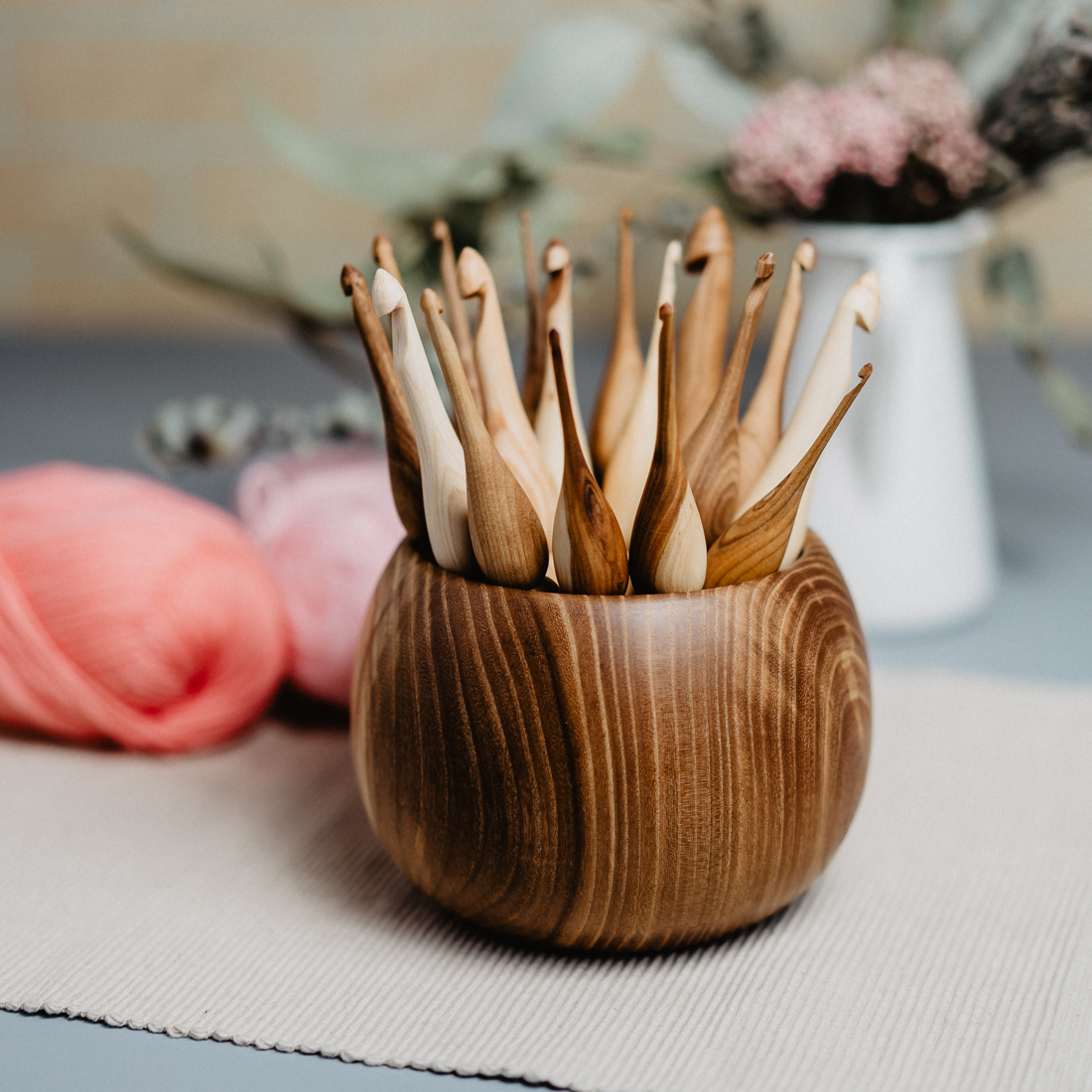 Вязальные крючки (17 шт) из разных пород древесины в комплекте с клубочницей.