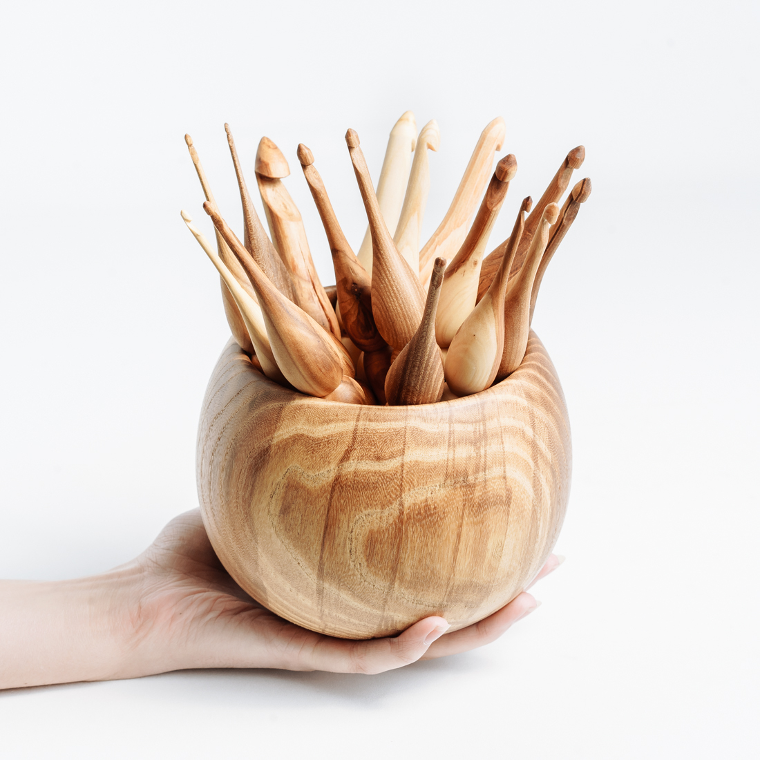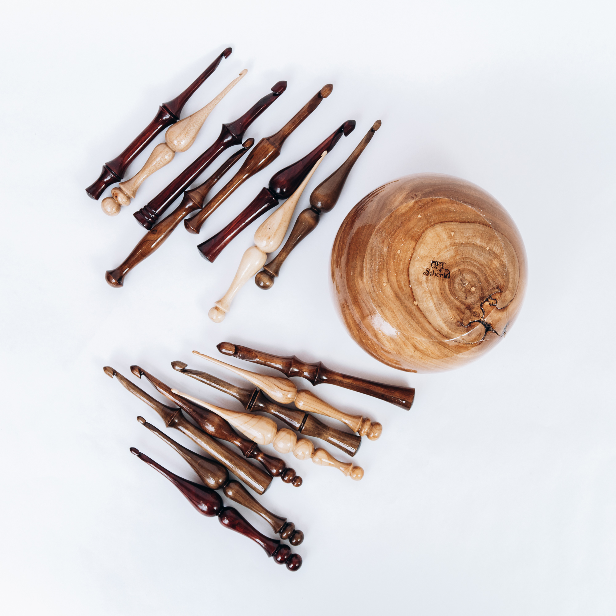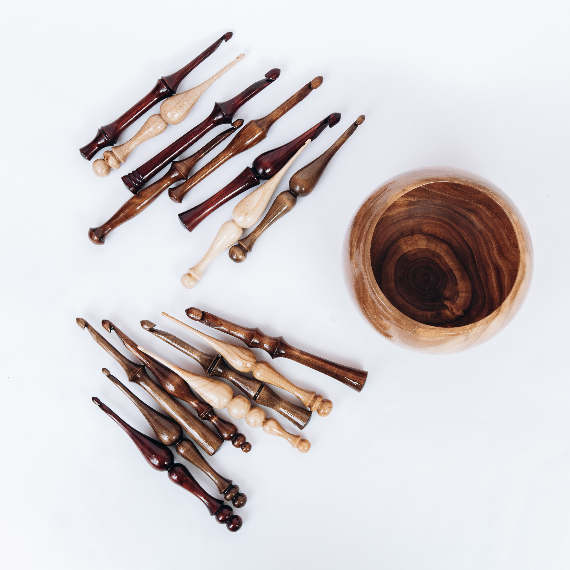 Вязальные крючки (17 шт) из разных пород древесины в комплекте с клубочницей.