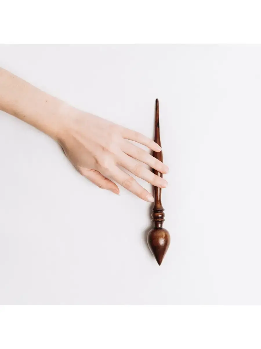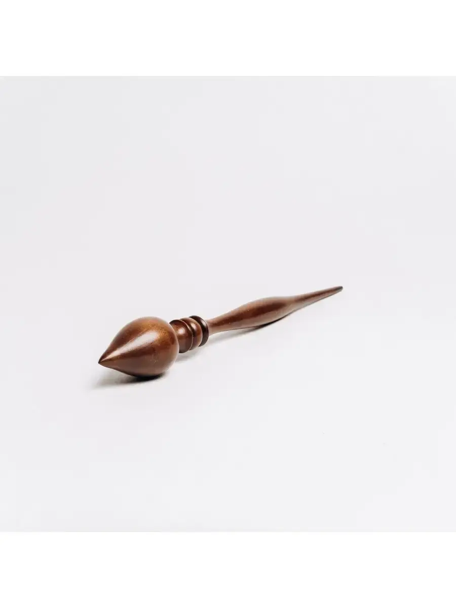 Опорное веретено для прядения из древесины клена! Отполировано и покрыто лаком. Приятно и удобно в использовании! Маленькое русское веретено может стать хорошим сувениром-подарком для рукодельницы: для дочери, жены, матери, как по прямому назначению, так и в виде сувенира или украшения в интерьере, а также как деталь костюма для кукол в русском наряде. **Размер:** длина 24 см, диаметр 3,3 см.