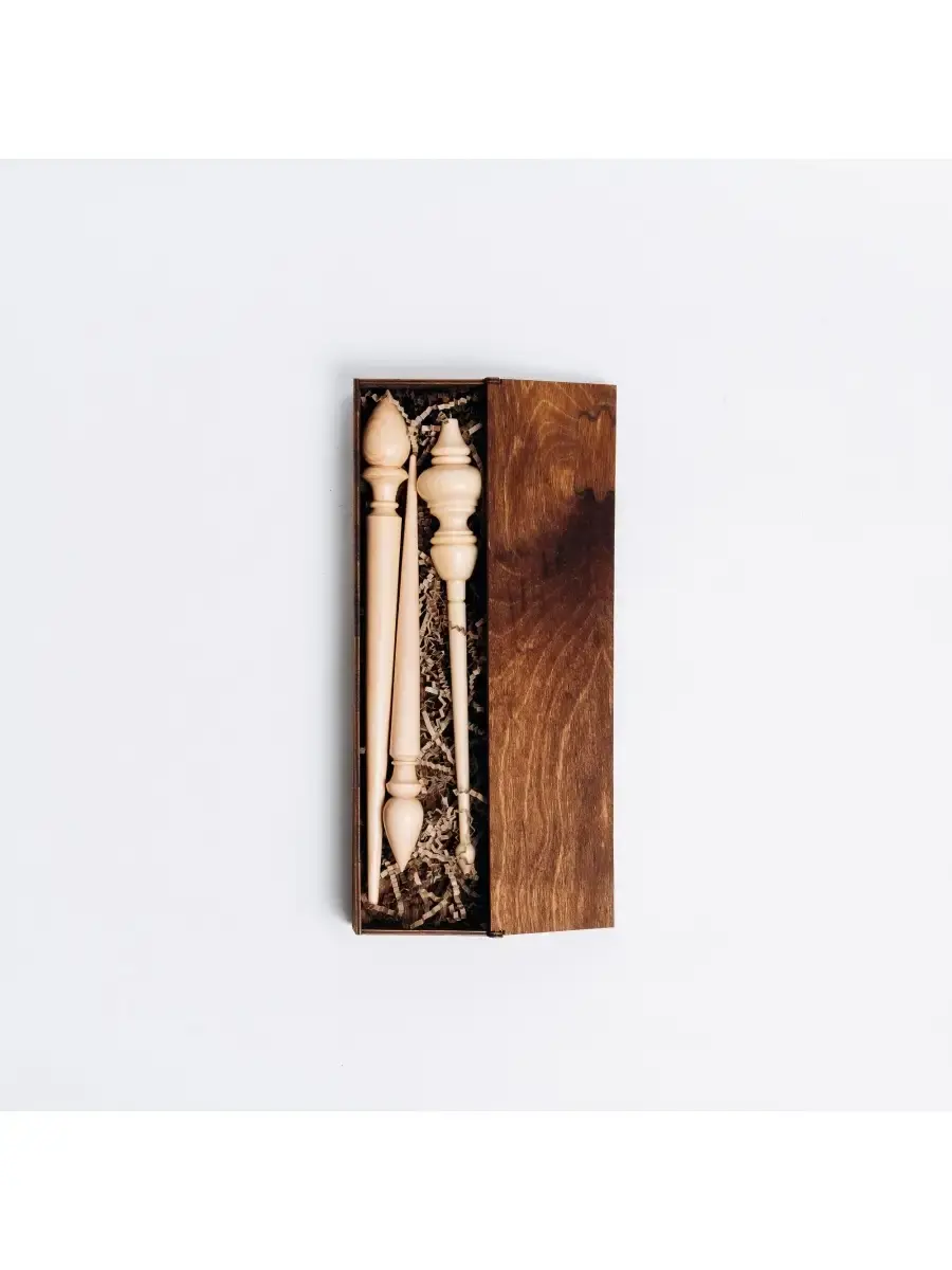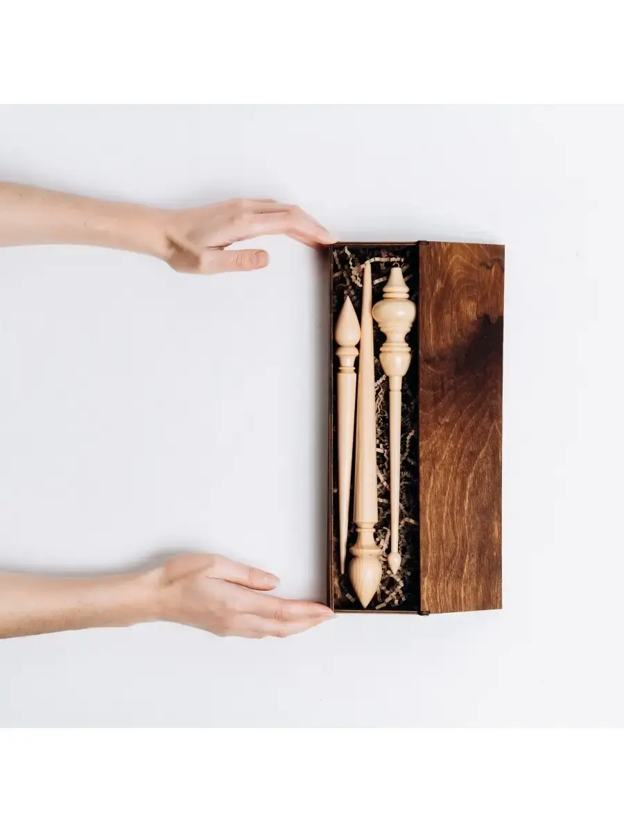 Набор из 3х веретен в подарочном органайзере, коробке. Подарочная коробочка (органайзер) для веретена - это не просто красивый аксессуар. Подаренное в достойной упаковке веретено без сомнения выглядит солидно и дорого, с первого взгляда заявляя о непревзойденной ценности содержимого.Хорошее веретено само по себе является удачным подарком. Но даже самое совершенное веретено, преподнесенное без должного оформления, утратит свой "блеск". Уникальная упаковка, служащая достойным облачением не только избавит вас от необходимости продумывать процесс вручения подарка, но и позволит презентовать его максимально эффектно!Размер: Короб: 33х8,5х5см. Веретено подвесное: длина 25 см диаметр 4,1 см. Веретено опорное малое: длина 25 см диаметр 2,3 см. Веретено опорное большое: длина 29 см диаметр 3 см.